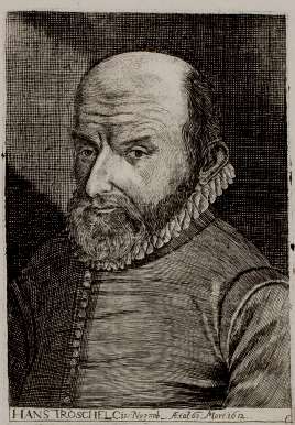 Hans Troschel d.Ä. kam 1578 von Bamberg nach Nürnberg und erhielt hier das Bürgerrecht. Er wurde einer der bekanntesten Kompassmacher der Stadt. 1582 wohnte er in der Kreuzgasse, bei seinem Tod "gegen den Freybencken über", also wohl in der heutigen Winklerstraße. Catharina (21.08.1575-02.08.1664), die jüngere Schwester seiner zweiten Ehefrau heiratete den Flachmaler Wolf Trexel (?-21.06.1644).