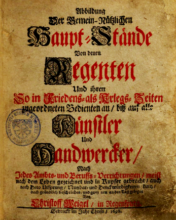 Weigel, Christoph: Abbildung der Gemein-Nützlichen Haupt-Stände von denen Regenten und ihren so in Friedens- als Kriegs-Zeiten zugeordneten Bedienten an / biß auf alle Künstler und Handwercker. Regensburg: Weigel 1698 |